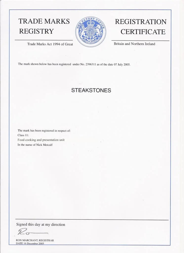 SteakStones is a Registered Trademark which was Registered during the formation of the company back in 2005. The trademark is owned by company owner Nick Metcalf on behalf of The Steak on the Stone Company Ltd. Any company advertising products under our Registered Brand Name is infringing our Registered Intellectual Property in an effort to benefit from our unique designs and the promotion of our products and this great concept. We take all steps possible to ensure that these companies undertaking illegal activity are quickly shut down on all channels where they infringing our rights.