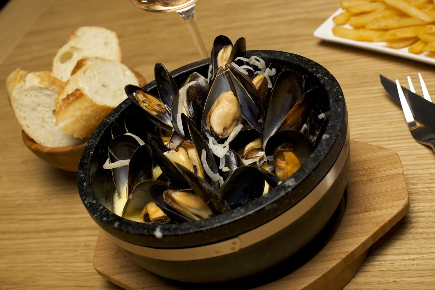 Moules Marinieres served in The SteakStones Sizzling Bowl
